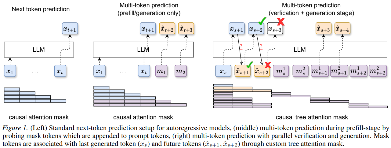 Proposes a training-free method for multi-token prediction by probing the model's embedding space, enabling faster inference through simultaneous prediction of multiple future tokens without any fine-tuning. Outperforms lookahead decoding with 12–17% improvement in average acceptance length and 6–15% improvement in wall-time speedup.